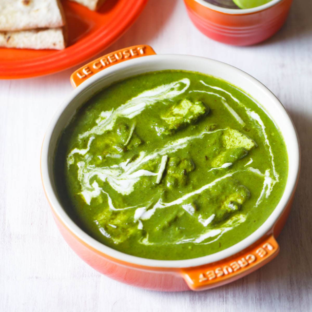 Spinat og hjemmelaget ost tilberedt med karrisaus, fløte, smør og cashewnøtter. Serveres med salat, ris og nan. Inneholder:: Hvetemel, cashewnøtter og melk .