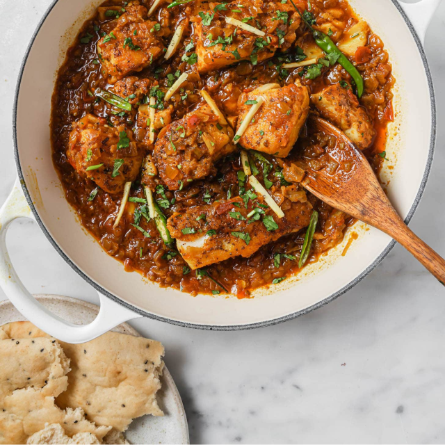Fisk tilbredt i tykk karrisaus, sautert løk, paprika og sopp. Serveres med salat, ris og nan, Inneholder: Hvetemel, fisk, melk og cashewnøtter.